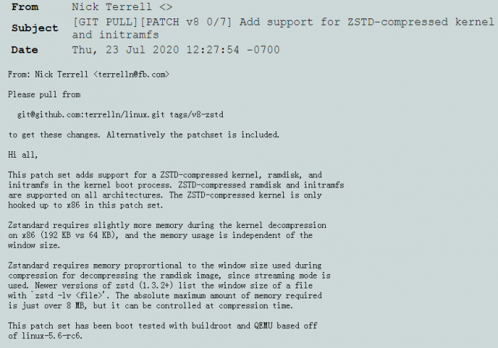 根据目前的情况来看,内核对 Zstd 的支持有望在下一个版本中(Linux Kernel 5.9)实现。一旦 Zstd 进入内核主线,Nick 的后续计划是放弃对 BZ2 和 LZMA(1) 的支持。这将有助于清理更多的内核代码,因为 Bzip2 和 LZMA 目前并没有在内核树之外的其他地方使用。