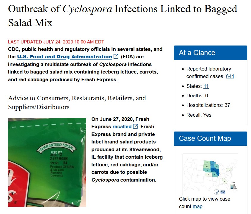 这次涉及Fresh Express沙拉产品的特殊沙拉召回是在6月27日宣布的。上周晚些时候,疾控中心返回了关于此事的最新情况,透露随着疾病报告的不断涌现,许多机构正在调查此次疫情。截至7月24日,本次疫情下已有641人被确认感染了环孢菌。