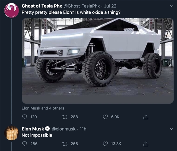 这种提议也获得马斯克的肯定。但是当前特斯拉官方并未对加热改色的方法,给出明确答复。马斯克也只是从理论层面上证明了此种方法的可行性。不过,将来Cybertruck皮卡上市之后,个人也可通过改装店进行改色操作。