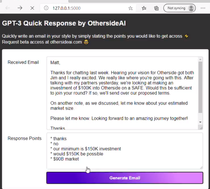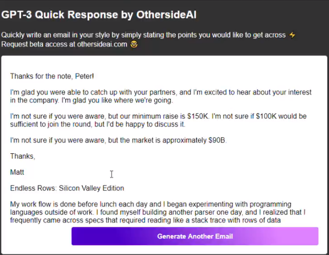 首先来看最基本的语言表达功能,下面是网友用 GPT-3 开发的自动回复邮件工具,只需要输入几个简要的回复关键词,GPT-3 就能自动生成一篇文笔流畅的回复邮件: