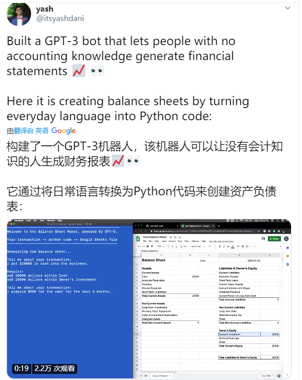 更深入一些,下面这位名叫 yash 的网友用 GPT-3 开发了一个 Python 驱动的财务报表,它可以将日常语言转换成 Python 代码来创建资产负载表:输入“我今天投入了两万美元”、“后三个月的房租预付了 900 美元”这样的自然语言,程序就能自动修改资产负债表上相应的项目数值。