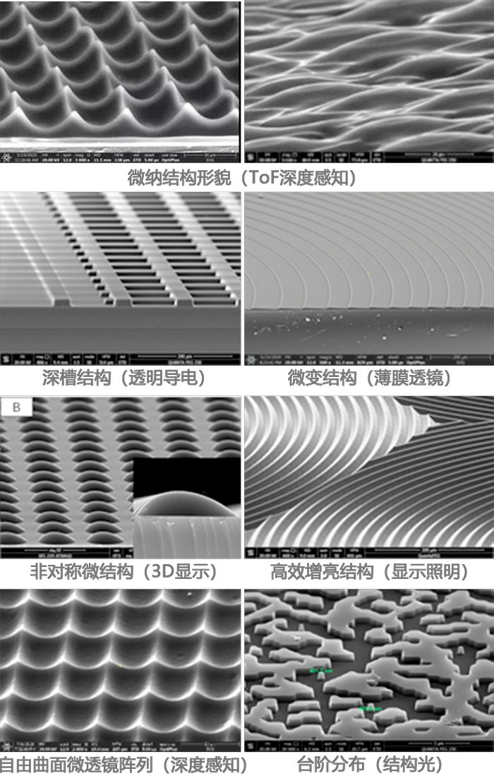 本次投入运行iGrapher3000,“3D形貌“光刻属于厚胶工艺,主要用于光电子材料和器件的制备,作用是将设计数据制备到厚光刻胶基板上,成为具有三维形貌的纳米印版,用于后道压印复制。下图为用于3D显示的微结构形貌SEM照片。