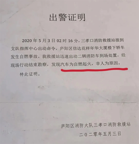 但让人意想不到的是,新车提车23天后,在凌晨时分突发自燃,车内被完全烧毁。后来,消防部门提供了出警证明,认定车辆自燃非人为原因。