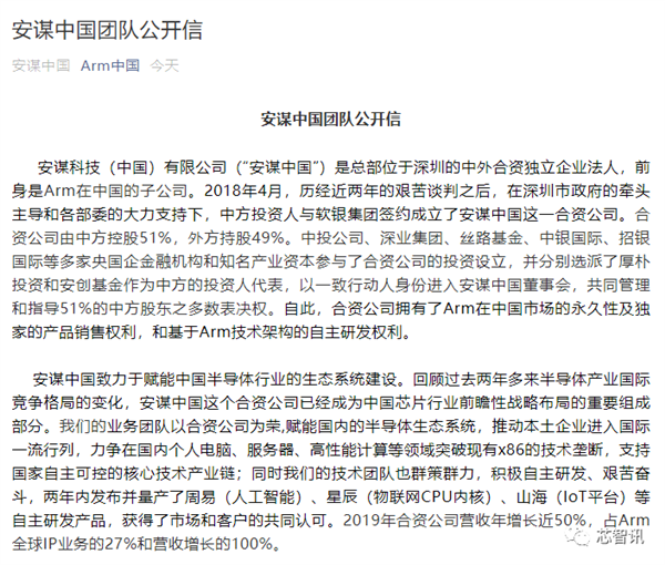 根据今天安谋中国声明中公布的信息显示,2019年合资公司营收年增长近50%,占ARM全球IP业务的27%(芯智讯查询到的资料显示,安谋中国成立之前这个比例为25%)和营收增长的100%。显然,中国业务对于ARM来说极为重要。