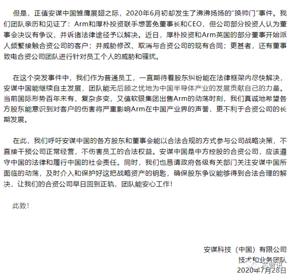 7月28日下午,安谋中国(ARM中国)通过官方微信发布公开信,指控ARM公司及厚朴投资在罢免安谋中国董事长兼CEO吴雄昂未获成功之后,厚朴投资和ARM英国的部分董事开始派人频繁接触合资公司的客户,并威胁修改、取消与合资公司的现有合同;更甚者,还有董事致电合资公司团队进行针对员工个人的威胁和骚扰。