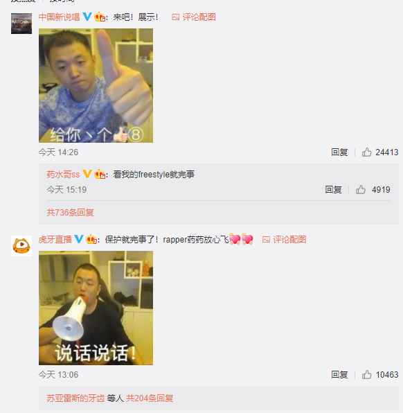 随后,中国新说唱在药水哥微博下方跟评:“来吧!展示!”,“看我的freestyle就完事”,药水哥回应道。