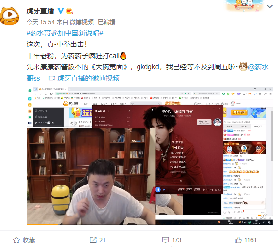 虎牙直播官微也为药水哥应援:“保护就完事了!rapper药药放心飞”“药药勇敢飞,药丝保护你,兄弟萌把保护敲在公屏上! ”,并分享了药酱版本的《大碗宽面》,感兴趣的可以点此观看。