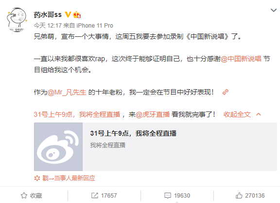 药水哥发微博称:“弟萌,宣布一个大事情,这周五我要去参加录制《中国新说唱》了。一直以来我都很喜欢rap,这次终于能够证明自己,也十分感谢@中国新说唱 节目组给我这个机会。作为@Mr_凡先生 的十年老粉,我一定会在节目中好好表现!”