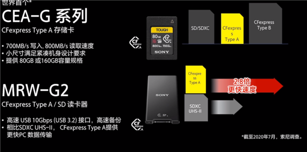 今晚索尼发布了全画幅微单Alpha 7S III,除了带来了全新的4K 120p视频之外,这次还使用了双卡槽设计,索尼也一道推出了TOUGH三防CFexpress Type A存储卡CEA-G系列,及配套的读卡器,读取速度达到了800MB/s,比常见的SSD还要快,不过售价也不便宜,160GB要4199元了。