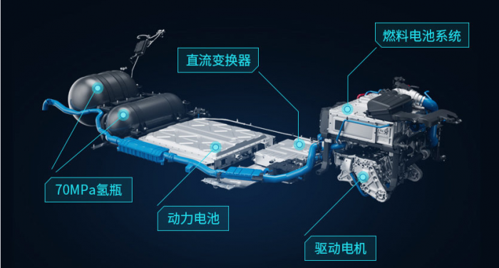 据介绍,Aion LX 氢燃料电池版动力系统是由电动机、燃料电池管理系统、动力电池及53L和77L的两个70MPa氢罐组成。