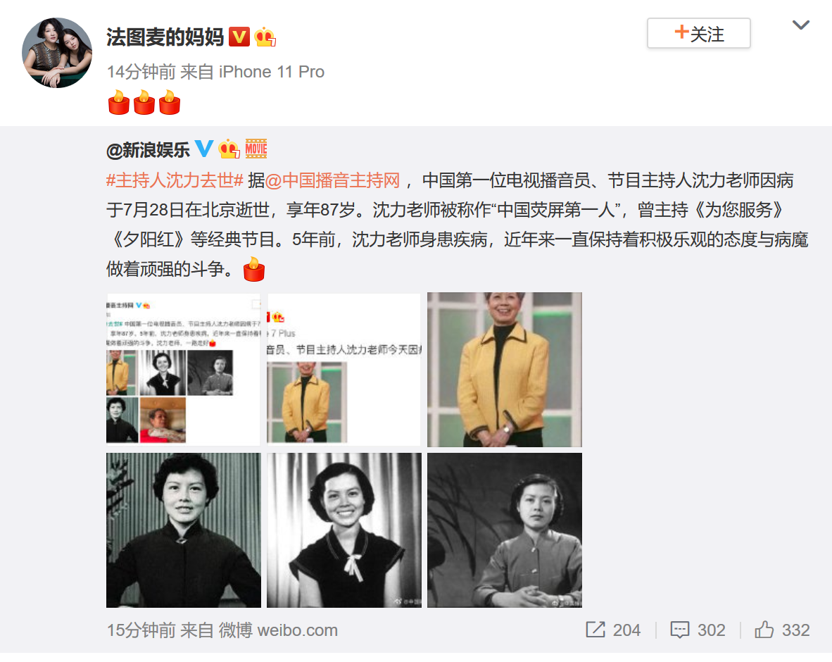 曹可凡(@可凡倾听):中国第一代电视主持人沈力老师今天下午驾鹤西游。记忆中,每次和沈力老师见面,均可感受其温婉优雅高贵气质,在轻柔的语言里,流淌着一股爱的暖流。她如同我们的长辈,关心、爱护着我们。每每看到我们点滴的进步,她便给予鼓励和支持!沈力老师,您永远是我们的楷模与榜样!您赐予晚辈的点点滴滴,我们将永远铭记于心!