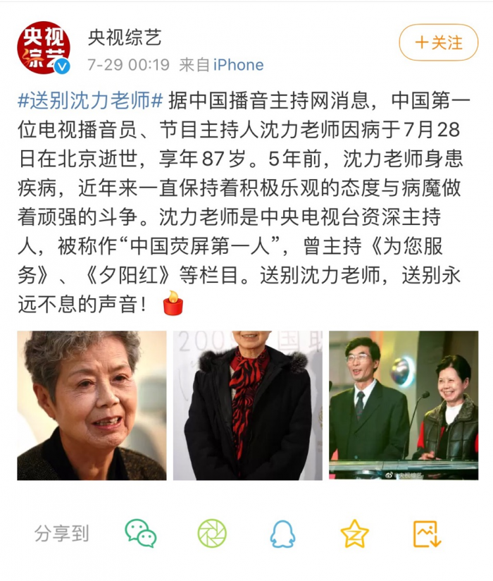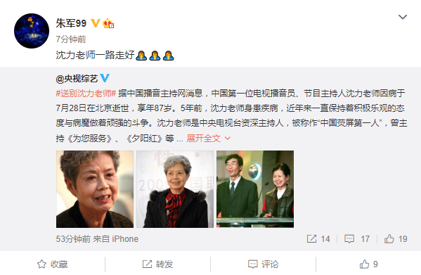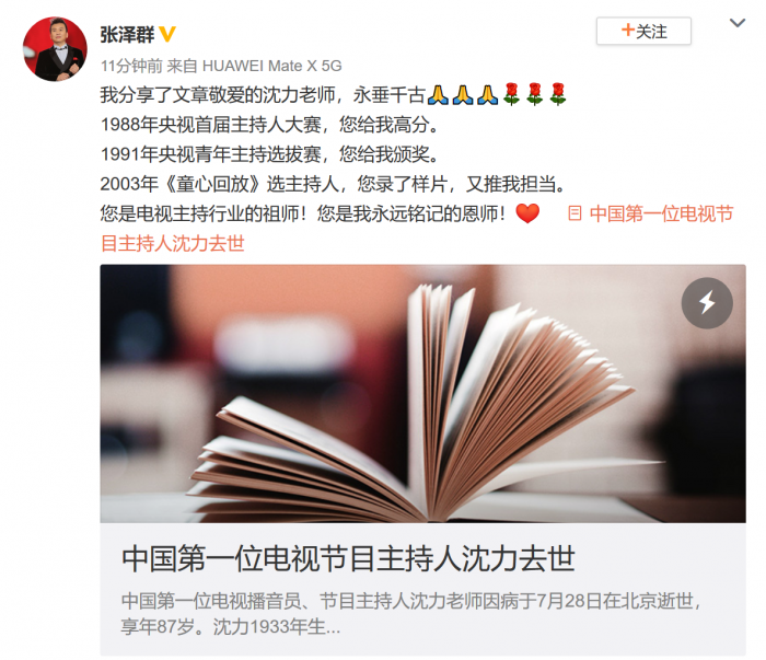 张泽群(@张泽群):敬爱的沈力老师,永垂千古。1988年央视首届主持人大赛,您给我高分。1991年央视青年主持选拔赛,您给我颁奖。2003年《童心回放》选主持人,您录了样片,又推我担当。您是电视主持行业的祖师!您是我永远铭记的恩师!