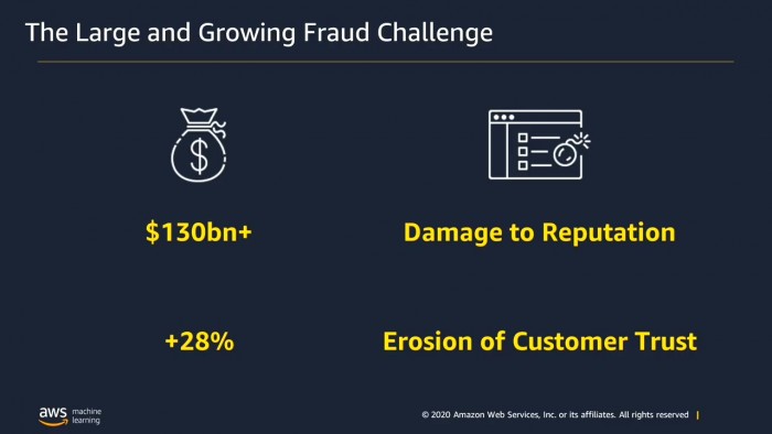 全球每年都有数十亿美元的资产被在线欺诈骗取。在线开展业务的公司特别容易受到不法分子的攻击。这些不法分子经常使用不同的攻击方式,例如创建虚假账户或者用偷来的信用卡付款。各个公司通常使用欺诈检测应用程序来发现欺诈者,并在他们对公司业务造成巨额的业务影响之前阻止他们。但是,这些应用程序通常依赖于业务规则,而业务规则则难以跟上欺诈者改变自己的行为和方法的速度。最近的欺诈检测应用程序已经开始尝试使用机器学习。但是,他们通常使用基于通用数据集和欺诈行为的一刀切方法,而这些数据集和欺诈行为与您的业务并非直接相关,因此其准确性受限。