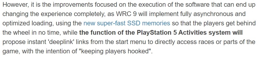 “然而,得益于专注于软件执行的改进,这能完全改变游戏体验,因为《WRC 9》将全面异步执行和载入优化,使用新的超快SSD内存,这样玩家们能立刻进入游戏。而PS5的Activities系统功能将可以让玩家从开始菜单启动即时‘深度链接’,直接进入到游戏比赛或其他部分,目的是让玩家着迷上瘾。”