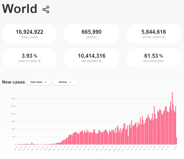新冠疫情在全球蔓延之际,当地时间7月27日,世界卫生组织总干事谭德塞在瑞士日内瓦举行的简报会上称,新冠很可能成为世卫组织有史以来宣布的最严重的全球突发公共卫生事件。他将在本周再度召集世卫组织紧急委员会进行评估。据英国广播公司(BBC)报道,自1月以来,全球报告新冠确诊病例超过1600万例,死亡病例超过65万例。