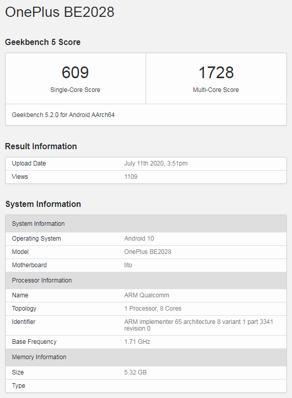 Geekbench 清单显示,BE2028 设备还具有 6GB RAM、预装 Android 10 移动操作系统,单核 / 多核成绩分别为 609 / 1728 。