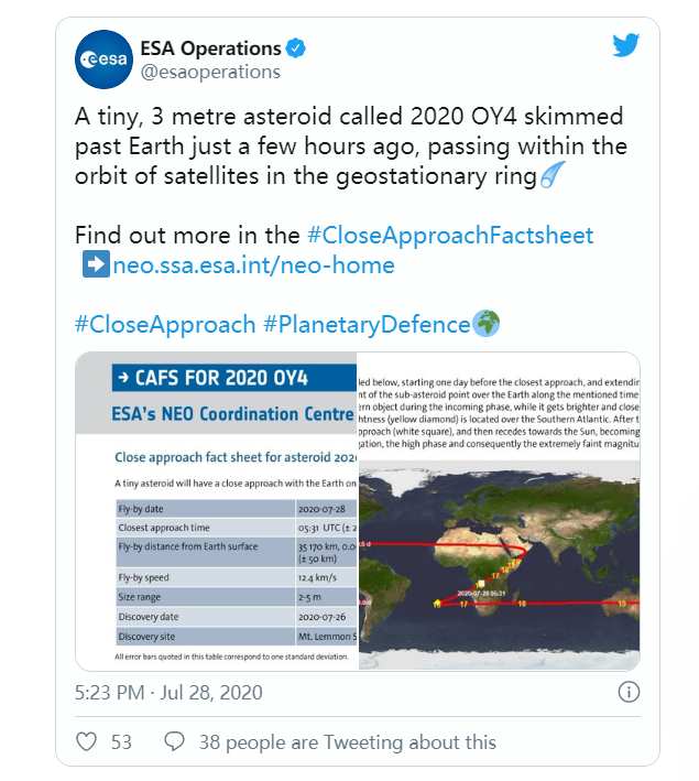 据外媒7月29日消息,日前,有一颗名为“2020 OY4”的小行星被发现在周二“偷偷”掠过地球。据了解,这颗小行星经过时很安静,并没有影响到我们的星球或任何卫星。