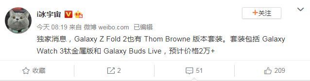 据悉,在 Galaxy Z Fold 2 的 Thom Browne 套装中,还包括了钛金版的 Galaxy Watch 3 智能手表、以及 Galaxy Buds Live 真无线耳机,预计售价将超过 2850 美元 / 2 万 RMB 。