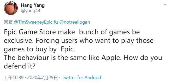 网友Hang Yang问道:Epic游戏商城独占了很多游戏。而且强迫想玩这些游戏的玩家必须使用Epic,这和苹果的行为如出一辙你怎么解释这个?