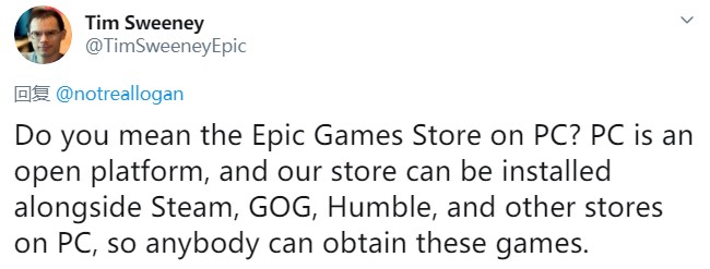 Tim Sweeney回答说:你是不是想说PC端的Epic游戏商城?PC是个开放性的平台,你安装我们平台的同时也可以安装Steam、GOG、Humble和其他游戏平台,大家都可以在这些平台上获取游戏。