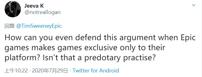 接着网友又在这则推特下面问了很多犀利的问题,网友Jeeva K问道:你怎么解释Epic独占游戏的行为呢?这难道不是一种弱肉强食的做法吗?