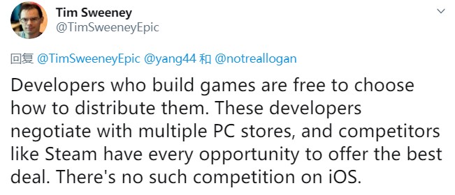 Tim Sweeney回答说:独占游戏是一个新的游戏平台对付那些已经在市场上站稳脚跟竞争对手的方式,类似于视频服务,如Netflix和迪士尼+及其独家内容。而且游戏开发者们也可以自由选择怎样发行游戏。这些开发商会与多家PC游戏平台进行谈判,而像Steam这样的竞争对手有充分的机会提供最优惠的交易。在iOS上就没有这样的竞争。