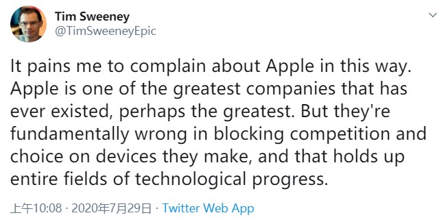 Tim Sweeney在推特中称:用这种方式吐槽苹果让我很痛苦。苹果是有史以来最伟大的公司之一,也许是最伟大的。但是,他们在扼杀竞争(垄断)和他们制造的设备的选择上犯了根本性的错误,这阻碍了整个技术领域的发展。