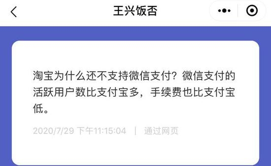 针对网友传闻,王兴在饭否上回应称,淘宝为什么还不支持微信支付?微信支付的活跃用户数比支付宝多,手续费也比支付宝低。