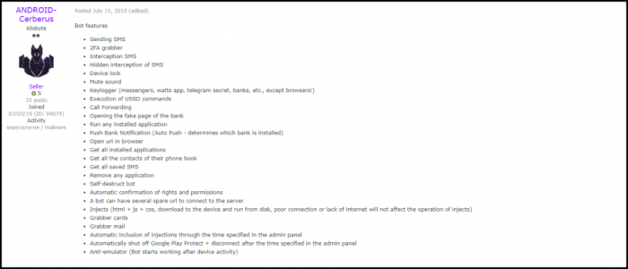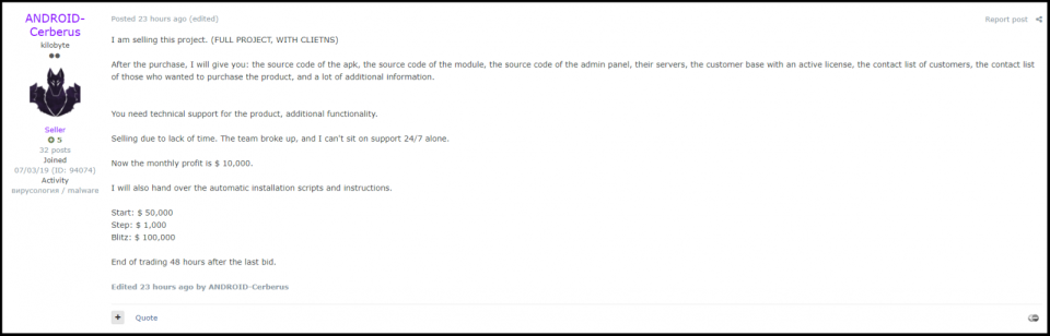 为了吸引潜在的竞标者,卖家在该帖子中声称,此 Android 恶意软件每月可产生 10,000 美元的利润。与 Cerberus 维护者达成协议的买方将获得恶意 APK 的源代码以及模块、管理面板和服务器。公告提到,Cerberus 的团队已经解散,无法提供 7×24 小时的技术支持,所以打算连同服务器一块卖掉,让其他人来进行运营。