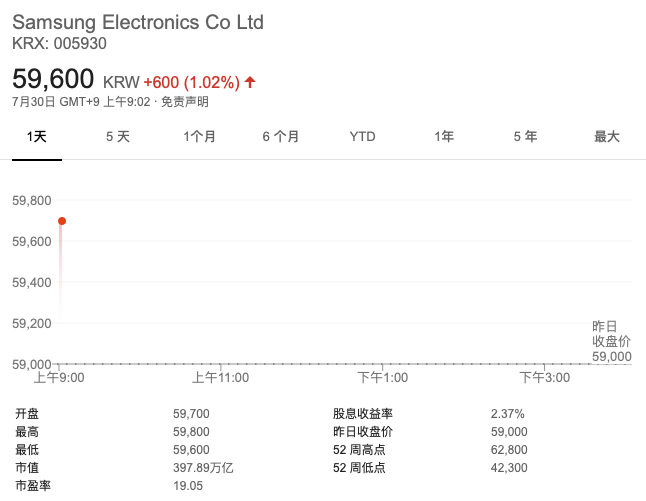 三星第二季度净利润超出分析师一致预期,推动股价在早盘交易中上涨逾1%。