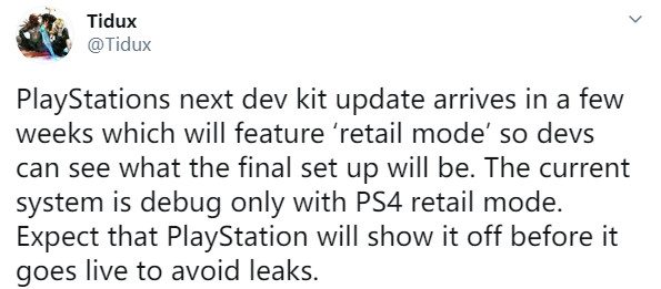近日专注于PS消息的业内人士Tidux发推暗示,索尼可能很快会正式公布PS5主机的UI。因为PS5开发机下一次更新几周内就要到来,届时会有“零售模式”,这样开发者就能看到游戏的外观以及与PS5最终零售设置的互动。他推测索尼将在这次更新之前展示PS5的UI,以免开发者使用零售模式带来的潜在泄露。
