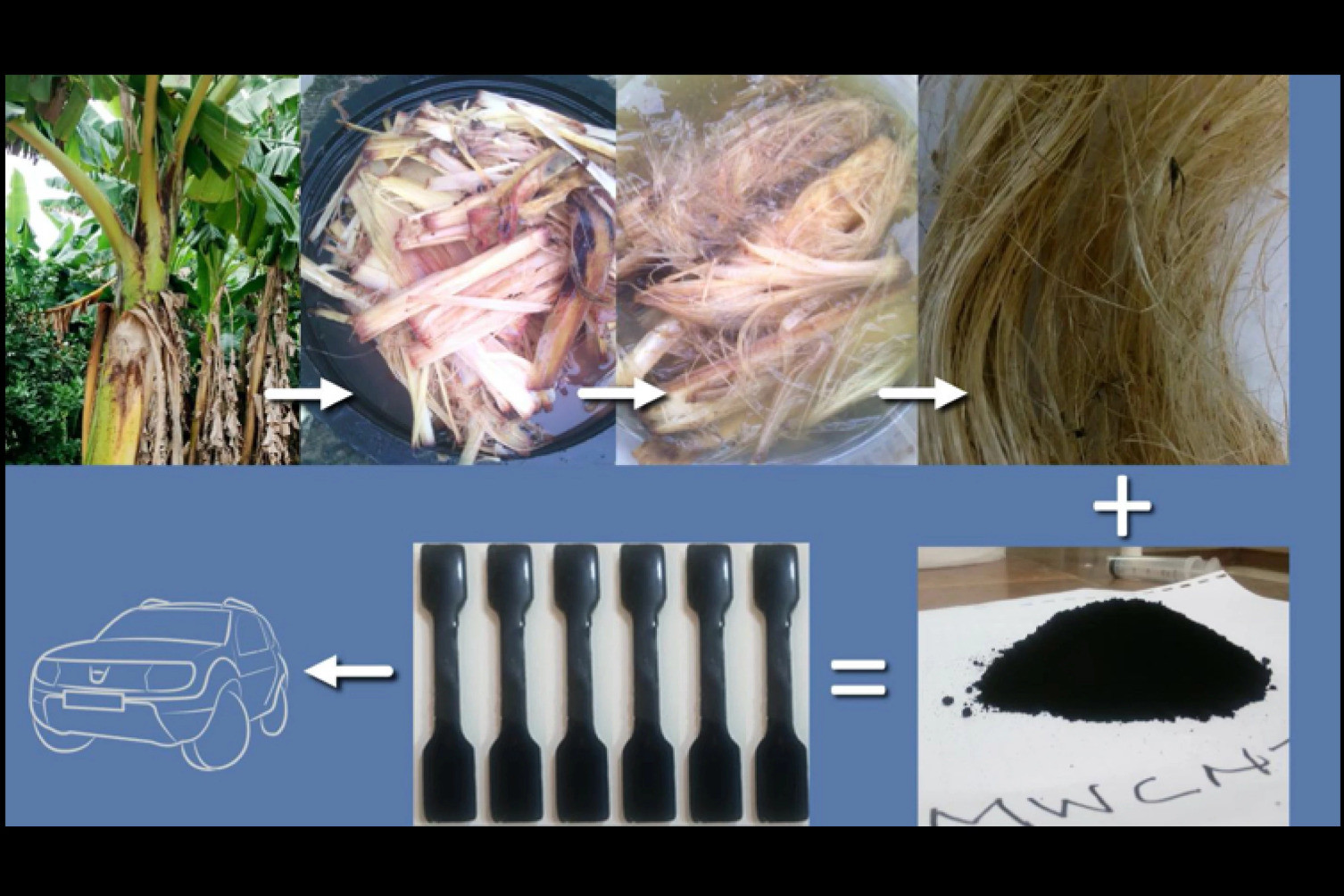 这些纤维能够更好地跟环氧树脂结合,而环氧树脂中也含有少量的多壁碳纳米管。科学家得到的最好混合是一份芭蕉纤维和四份树脂/纳米管的混合物,这些管只占材料重量的1%。这些混合物会被放入模具然后在室温下压缩24小时。