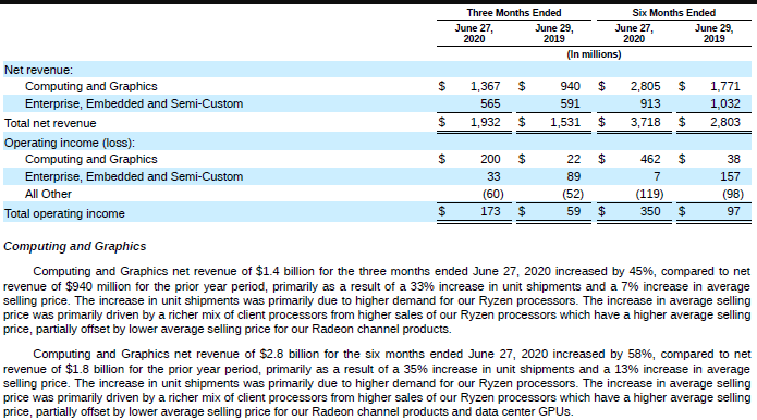在财报发布之后,AMD又公布了更详细的数据,介绍了旗下每个业务部门具体的营收及盈利情况,其中计算及显卡部门贡献了13.67亿美元的营收,相比去年同期的9.4亿美元大涨了45%。