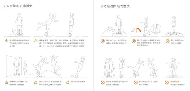 记者发现只有少数厂商,像Ninebot平衡车那样在非常醒目的位置贴了安全风险的提示,说明书上也详尽的说明了安全风险,引导用户佩戴头盔、安全驾驶,如果超速也会用语音提醒,对于消费者使用安全方面的提醒非常全面。