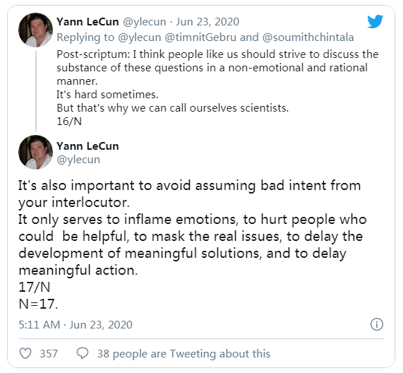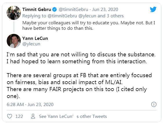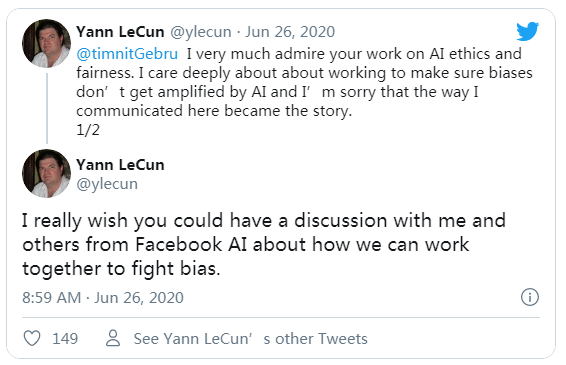 Yann LeCun后来在推文中向Timnit Gebru表示赞赏她在AI道德、公平方面的工作,并对自己的交流方式道歉,希望她能和Facebook AI的研究员一起交流如何一起和偏见作斗争。