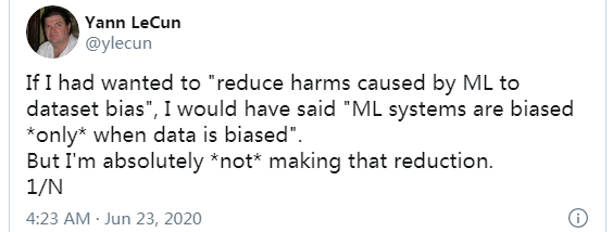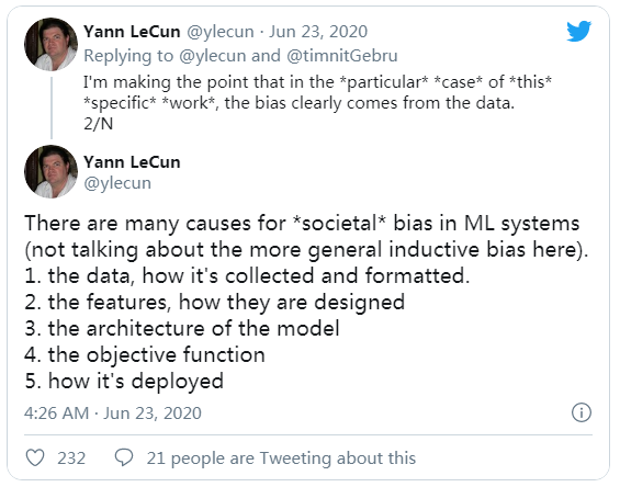 一开始争论的焦点在于:AI产生偏见的原因是否只是数据集导致?算法本身的缺陷能不能成为原因?尽管LeCun后来在一系列的推文中一条一条地解释自己的观点,指出自己同意各位专家的质疑,只是自己的论点建立在特定的条件下,数据确实不是AI偏见的唯一来源。