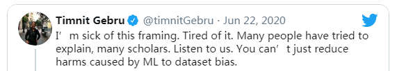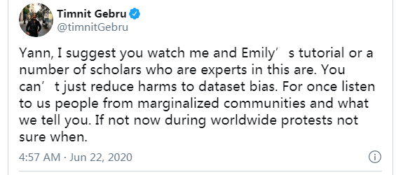 作为AI的公平性、问责制和透明性的领先研究者,Timnit Gebru首先在推文中对 LeCun 的言论表示“失望”,并指出机器学习系统中的偏见仅来自数据的观点是不正确的。她还建议Yann LeCun查看她之前做过的课程,因为她才是专家。