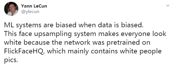 针对这张图,Yann LeCun在推特上发表了这么一句话:“当数据有偏见时,机器学习系统就变得有偏见。这个人脸上采样系统让每个人看起来都像白人,因为网络是在FlickFaceHQ数据集上预训练的,而这个数据集主要包含白人图像。”