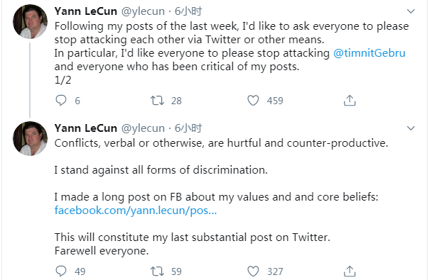 请社交网络上的所有人不要再互相攻击了,特别是对 Timnit Gebru 的攻击,以及对于我之前言论的攻击。无论是口头还是任何其他方式的冲突,都只会得到伤害和相反的结果。我反对一切形式的歧视。这将是我在推特上最后一篇帖子。