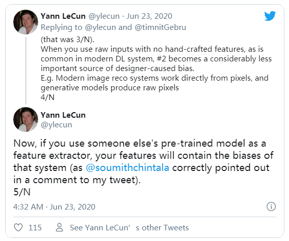 Yann LeCun后来在Timnit Gebru 的推特评论区连写 17 条回复:表示自己同意她的观点。