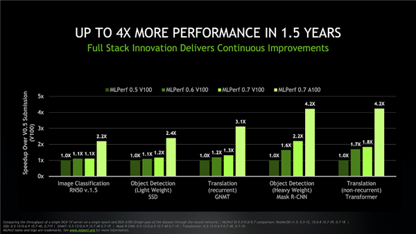 最新的测试结果显示,相较于首轮MLPerf训练测试中使用的基于Volte伏特架构V100处理器的系统,如今的DGX A100系统能够以相同的吞吐率,实现高达4倍的性能提升,这一切都是在仅仅一年半时间里做到的。