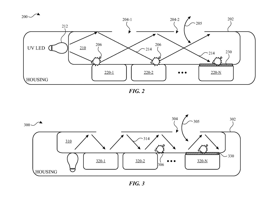 相反,苹果提出了一种系统,在产品外壳内部或传感器包装附近分解有机污染物,以恢复集成环境传感器准确读数所需的清洁环境,而该系统可以通过使用紫外线(UV)光来分解污染物。紫外线光线可以启动光氧化过程,从而导致人类皮肤带来的角鲨烯的分解,与紫外线反应后,角鲨烯被分解成三种副产品,它们对环境传感器没有危害。尽管紫外光可以是分解污染物,但紫外光会产生臭氧。因此,苹果还有一份专利申请,详细介绍了在小型设备内产生、控制和使用紫外线和臭氧的方法。