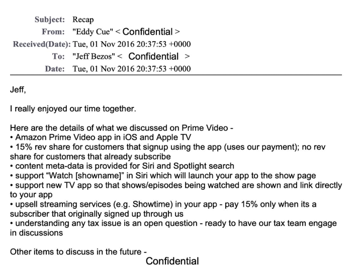 不过,2016年苹果高管艾迪·库伊(Eddy Cue)在发给杰夫·贝佐斯(Jeff Bezos)的一封电子邮件证实,苹果曾向亚马逊提供特殊待遇,让他们的内容出现在Apple TV上。