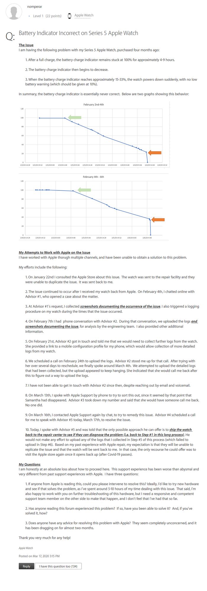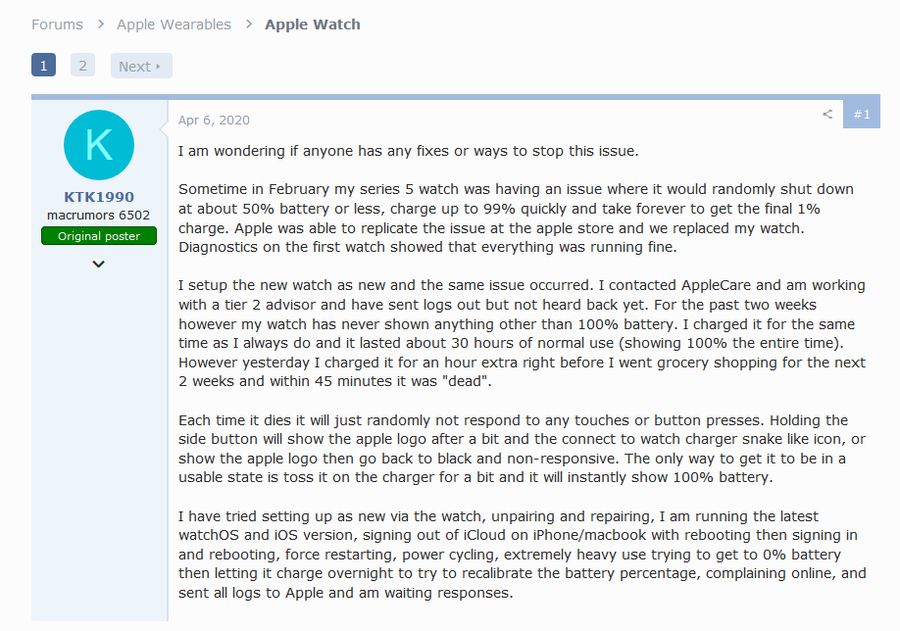 一位用户反馈称:“在最近一次更新之前,我的手表能够准确的报告它的电量。目前很难说是哪个更新导致了这个问题,也不排除其他原因导致的,但目前我运行的是 watchOS 6.2.8。在过去几周内,我的手表在一天内大部分时间(至少5-6个小时)报告接近于 100%,然后会下降到 53% 左右,然后就是突然关闭。一旦重新启动,它报告的电池电量为53%,但如果不放在充电器上,就会再次关机。”