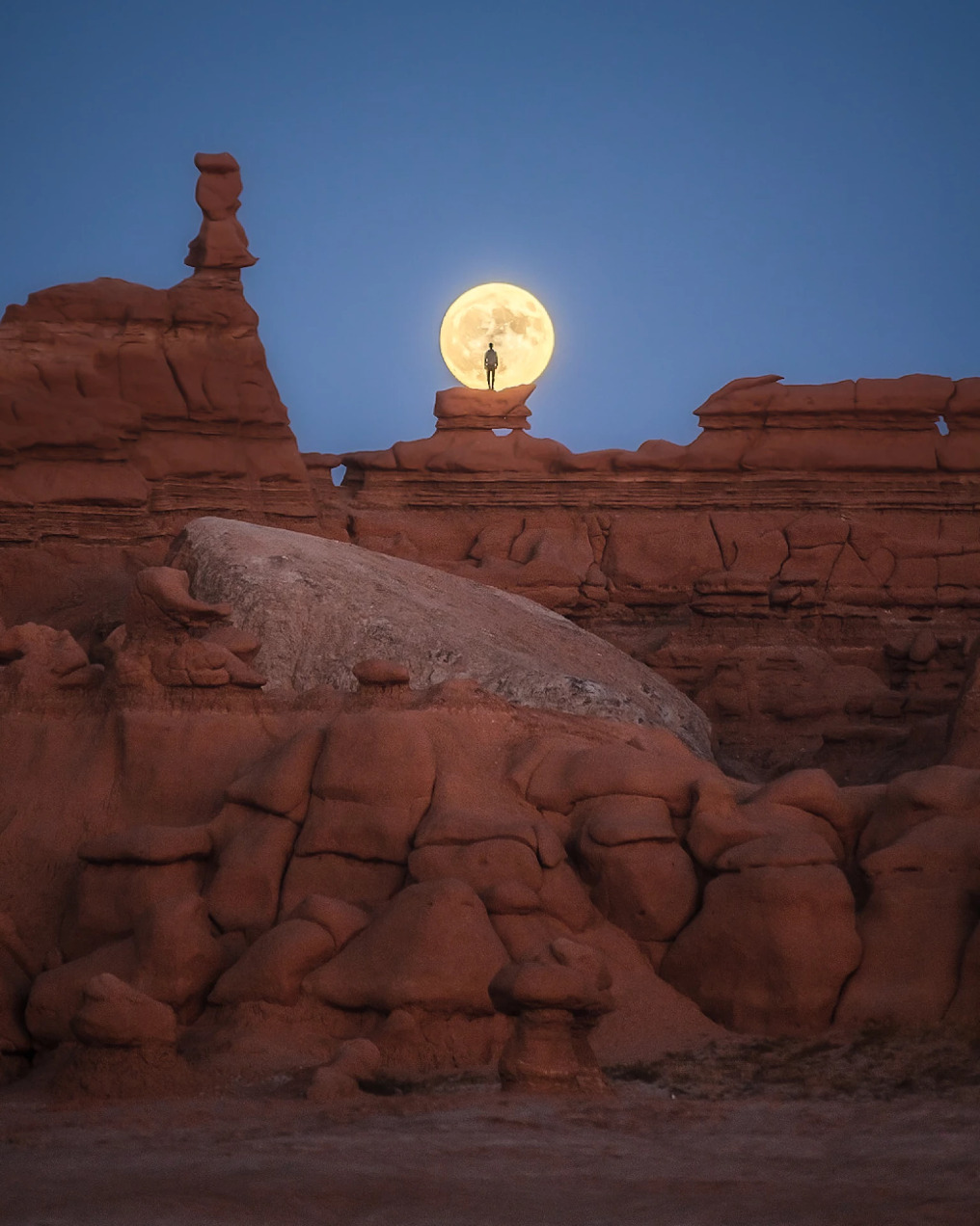 据外媒报道,Agora 2020年风景摄影大赛为大家带来了一组壮观的图片,从强大的闪电到一些引人注目的微小人物被庄严的自然环境淹没的照片。今年的风景大赛的最高奖项被授予了一张时机正好的照片:一名男子站在一轮壮丽的满月前。澳大利亚摄影师Luke Simpson表示,这张照片完全没有经过筹划拍摄的,因为当时他正在跟一个朋友在美国徒步穿越妖精山谷时偶然发现了这个美妙的画面。