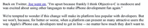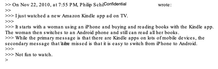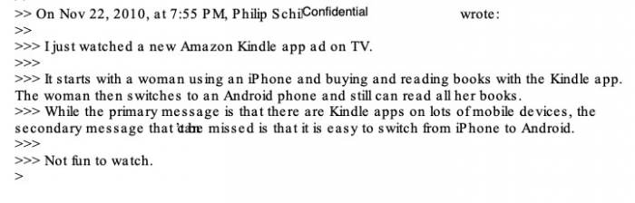 在一封电子邮件中,席勒写道:“我刚刚在电视上看到一条亚马逊Kindle应用的广告。最开始一名女子使用iPhone,从Kindle应用中购买并阅读电子书。然后,这名女子切换到Android手机上,仍然可以阅读她的所有电子书。尽管亚马逊传达的主要信息是许多移动设备上都可以使用Kindle应用,但伴随的信息是从iPhone切换到Android手机很容易。这看起来很糟糕。”