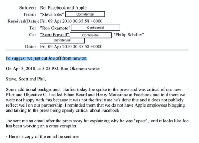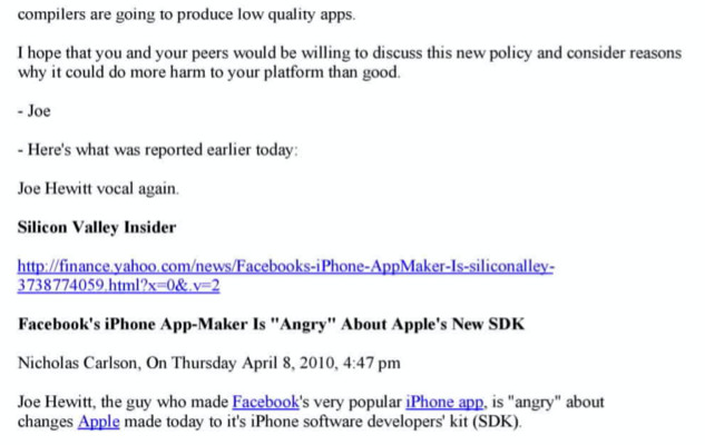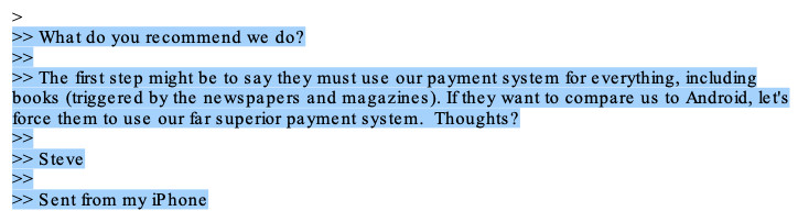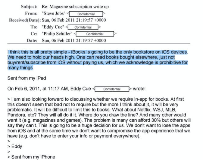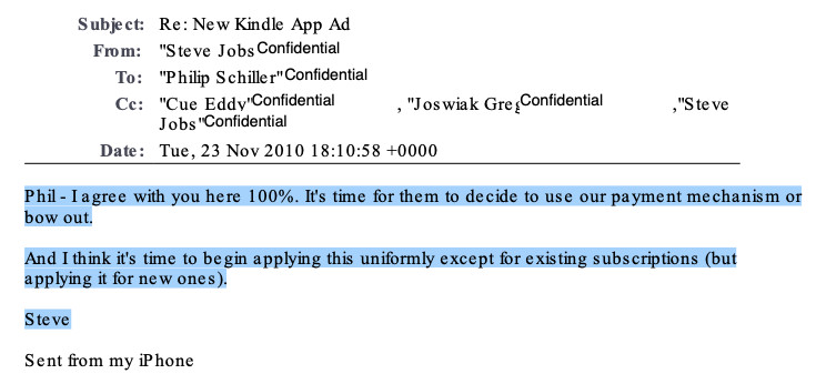 在回复另一个名高管艾迪·库伊的一封邮件中,乔布斯也强调,iBooks将会是iOS设备上唯一的电子书商店。他说:“我认为这一切都很简单,iBooks将成为iOS平台唯一的书店。我们需要抬起头来。人们可以阅读在其他地方购买的书,但不能在不向我们付钱的情况下从iOS购买、租赁或订购。”