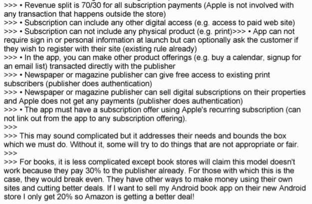 在这些对话发生时,苹果正计划公布新的App Store订购政策。乔布斯在回信中说,苹果可以说亚马逊“必须使用我们的支付系统去做任何事”,并公开宣布这样的调整是由新的报纸和杂志订购政策带来的。乔布斯写道:“如果他们想要把我们与Android相提并论,那么我们就要强迫他们使用我们更出色的支付系统。”