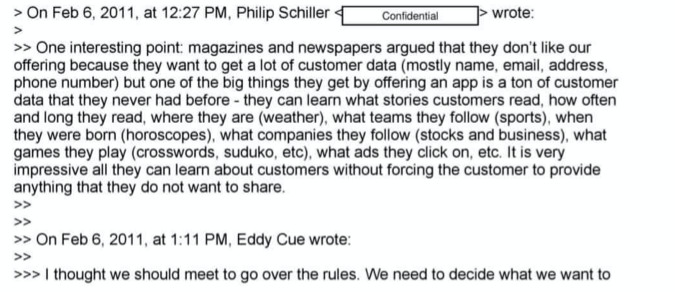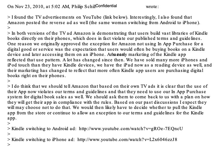 在另一封邮件中,席勒还表示:“我确实认为,我们应该告诉亚马逊,根据他们自己的电视广告,很明显目前他们的应用违反了我们的条款和规则,而他们也需要通过我们的应用内购系统来销售电子书。我们应该要求他们提供一份计划,证明他们将如何确保应用能符合规则。根据此前的讨论,预计他们很可能不会这样做。然后我们可能不得不做出决定,是从平台上下架Kindle应用,还是继续允许Kindle享受特殊待遇。”
