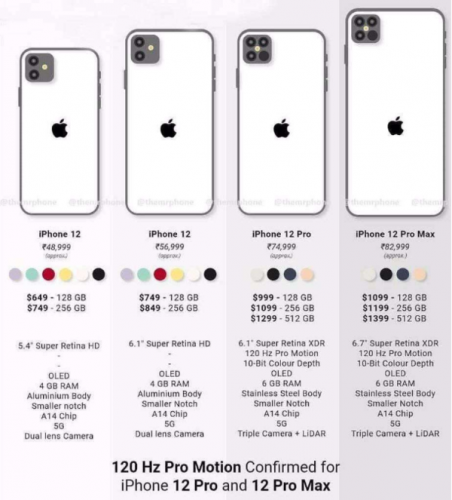 其他方面,根据此前曝光的消息,全新的iPhone12系列均将延续刘海全面屏设计,并标配OLED屏幕,采用类似iPhone 4的纯平中框,两款Pro版本将具有10位的颜色深度和120Hz刷新率。全系均搭载基于5纳米工艺制程打造的A14处理器,支持5G网络。此外,该系列新机还将延续前作的方形相机模组,其中,两款iPhone 12系列配备后置双摄,而两款iPhone 12 Pro系列则将配备后置三摄,且顶配版还将搭载LiDAR传感器。